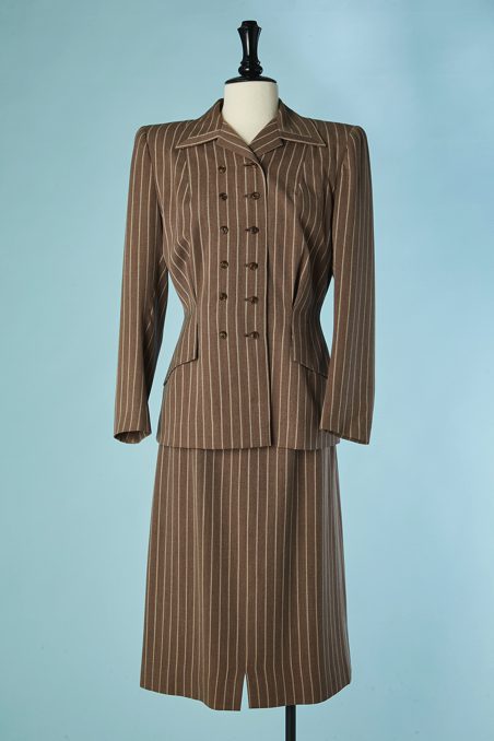 Tailleur croisé 1940 en lainage marron rayé écru, double boutonnage, manches longues épaulées, taille cintrée, poches avec rabat, jupe longue fendue devant