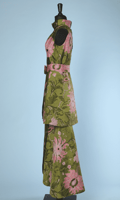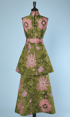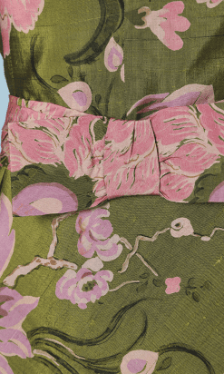 Tailleur jupe et veste 1950 en soie verte imprimé de fleurs roses, veste longue sans manches, col montant, plis sous col, croisée sous ceinture, petite ouverture dos et légèrement plus long derrière