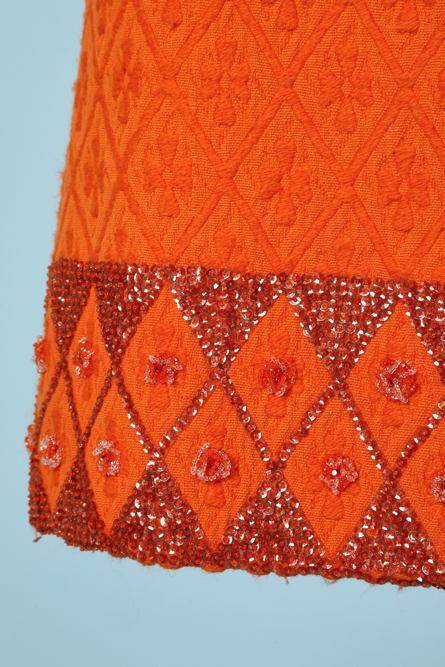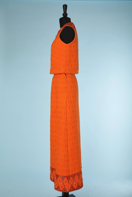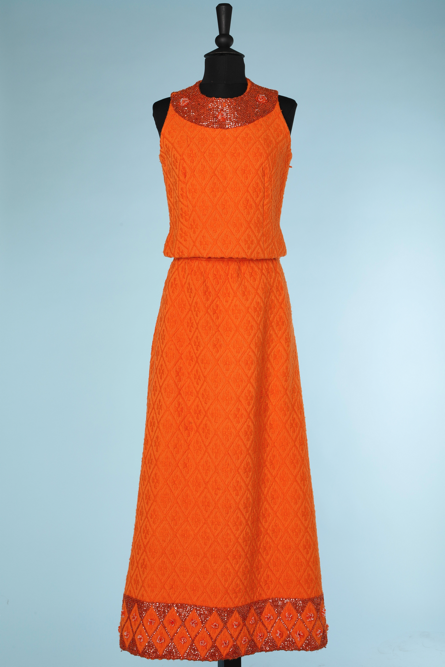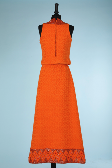 Tailleur jupe longue 1970 en lainage orange de losanges et de trèfles perlé et pailleté sur l’encolure et le bas de la jupe, haut sans manches et fermeture éclair dos