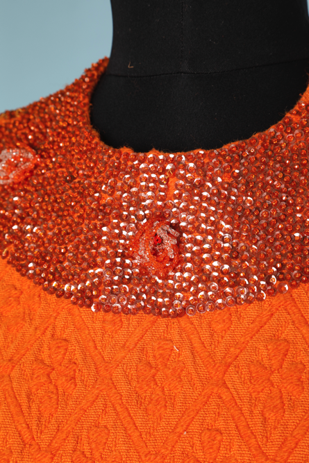Tailleur jupe longue 1970 en lainage orange perlé et pailleté