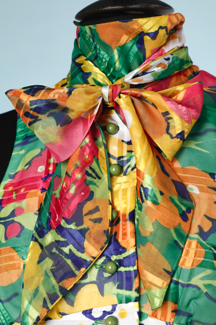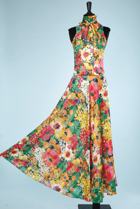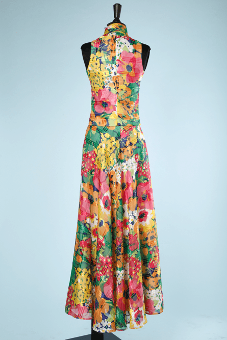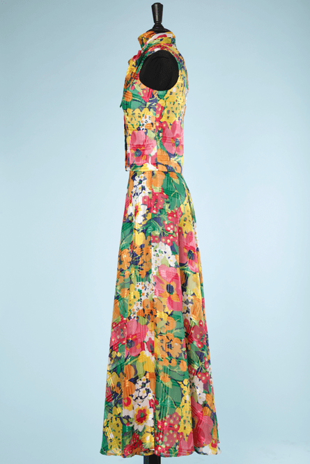 Long skirt suit and blouse 1970 printed with checks and multicolored flowers, sleeveless blouse, high collar and tie, long skirt very flared