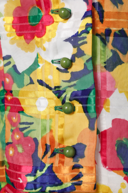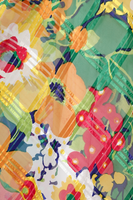 Tailleur jupe longue et chemisier 1970 imprimé de carreaux et fleurs multicolores, chemisier sans manches, col montant et cravate, jupe longue très évasée