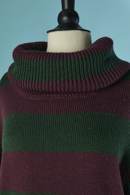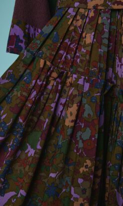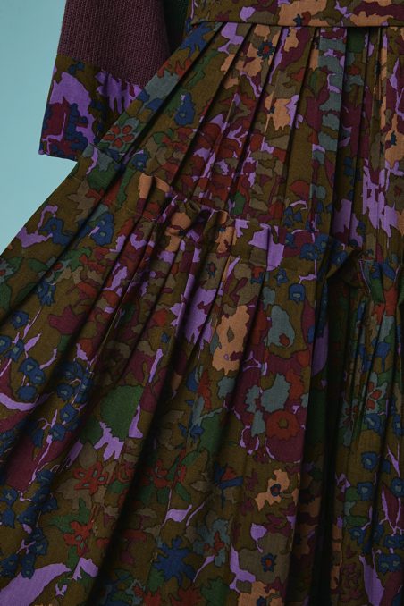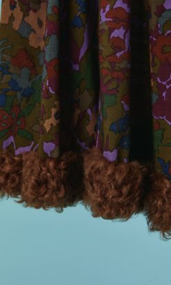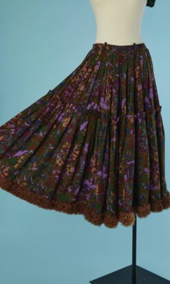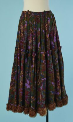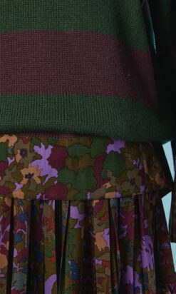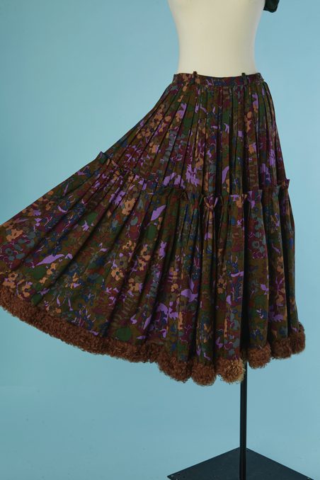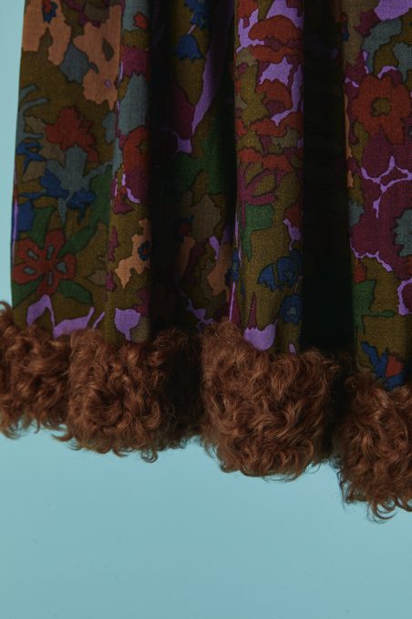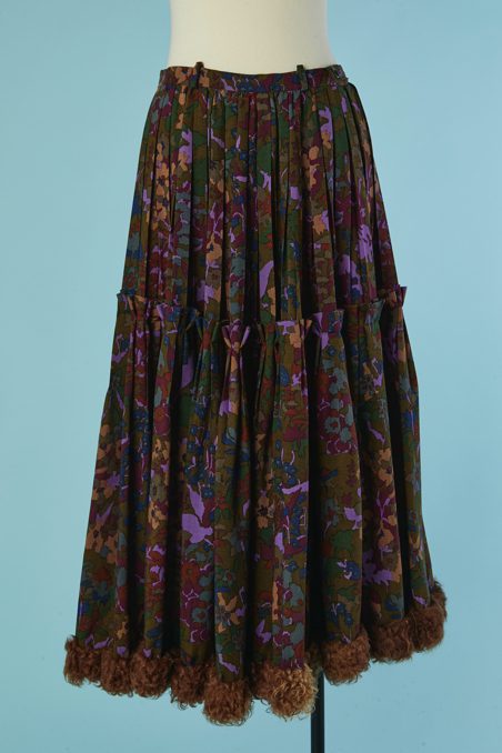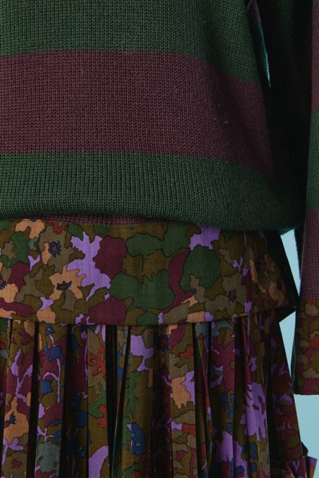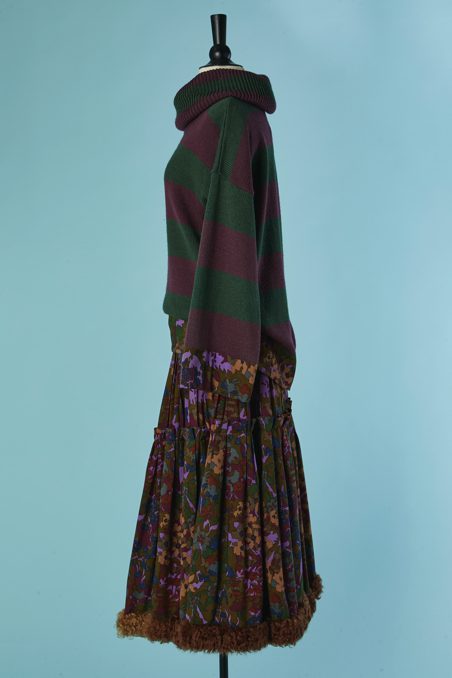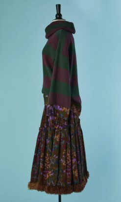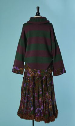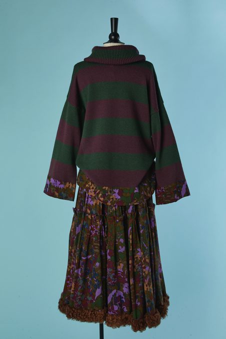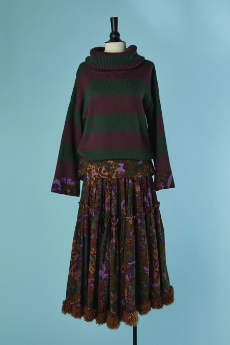 Ensemble Lanvin Pull et jupe circa 1970, Pull en tricot bordeaux et vert à manches longues avec des poignets dans le même tissu que la jupe, jupe évasée en lainage imprimé dans les tonalités d’automne, plissée sous taille avec une bordure en fausse fourrure marron imitant l’astrakan