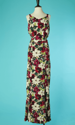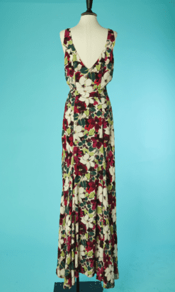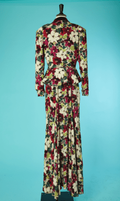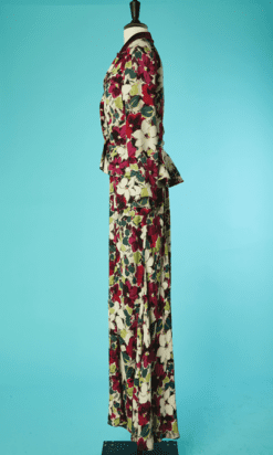 Tailleur du soir Lucien Lelong 1937-1938, en crêpe imprimé de fleurs et feuillages, Veste épaulée à manches longues avec basque, col châle avec partie en velours, boutons recouverts, Robe longue avec bretelles, ceinture dans le même tissu, dos nu en V, les deux pièces sont griffées