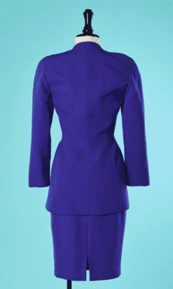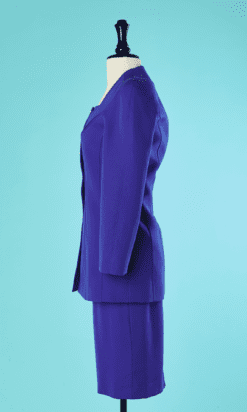 Tailleur Mugler en lainage violet, veste cintrée, manches longues épaulées, encolure en triangle, boutons pressions en métal avec la lettre M, jupe droite fendue derrière, étiquette blanche écriture noire, doublure violette
