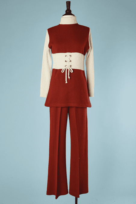 Tailleur pantalon 1970 en lainage écru et marron, tunique manches longues col cheminée, large taille bords côtes avec lacets, pantalon pattes d’éléphant