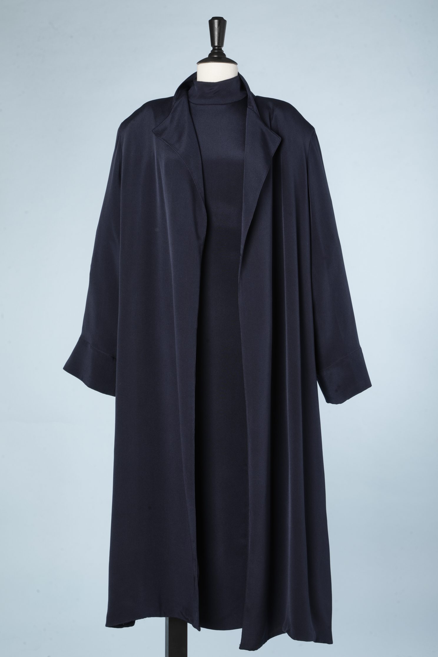 Ensemble Robe et Manteau en viscose marine Junko Shimada, Manteau manches longues, sans col et sans fermeture, dos lacé de haut en bas, Robe droite fourreau, col cheminée, lacée sur un côté de haut en bas sur un tulle noir