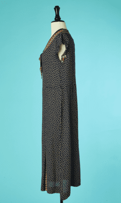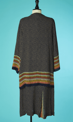 Tailleur robe et veste 1930 en soie marine imprimée de losanges multicolores, Robe droite, manches courtes, encolure imprimée avec deux nœuds et pompons dorés, Veste manches longues imprimée sur le bas des manches ainsi que sur le pourtour du bas de la Veste