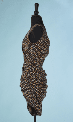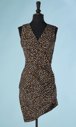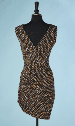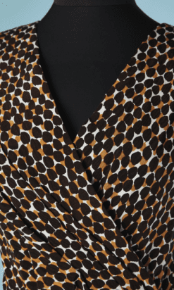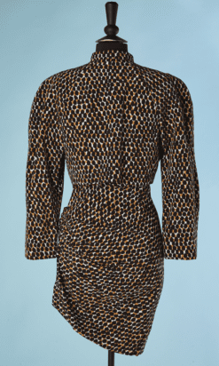 Tailleur robe et veste Pierre Balmain Ivoire circa 1980-90, en reps écru tacheté beige et marron foncé, Robe sans manches, encolure en v croisée, coupe asymétrique froncé sur une hanche, veste manches longues raglans épaulées, petit col montant, boutons noirs facettés