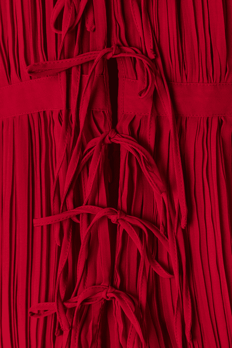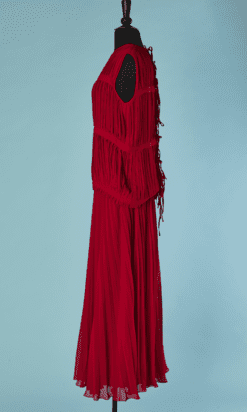 Tailleur Rochas vintage en mousseline de soie plissé rose fuchsia, sans manches, rubans cousus horizontalement, encolure ras de cou, se ferme derrière par des rubans, jupe longue évasée, étiquette noire et blanche Taille 40