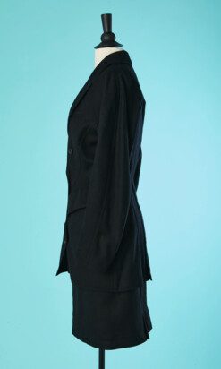 Tailleur vintage 1980-90 Alaïa en lainage noir, Veste longue, manches raglans, double boutonnage, col châle cranté, taille cintrée, poches avec revers, boutons dos sous la taille, jupe courte droite avec découpes et plis