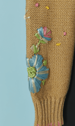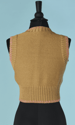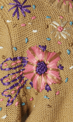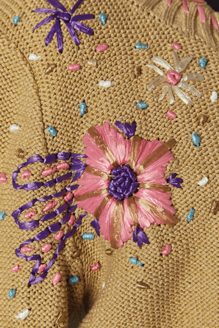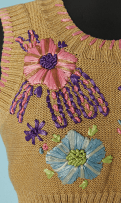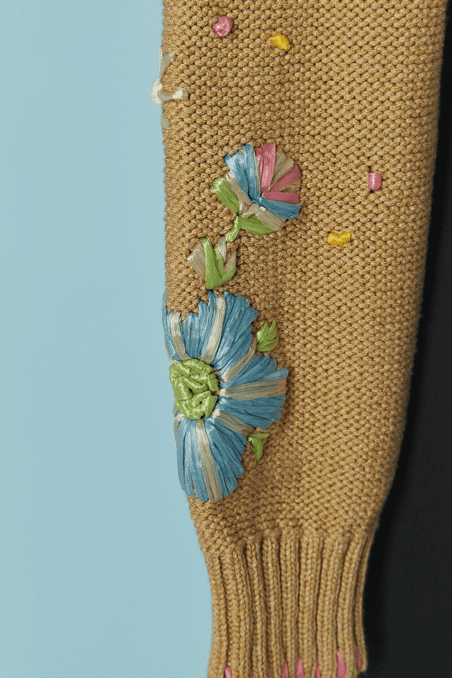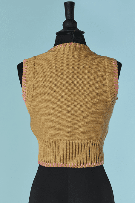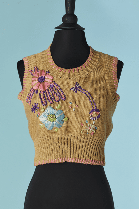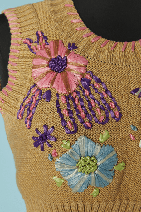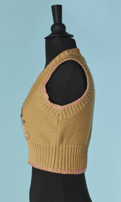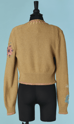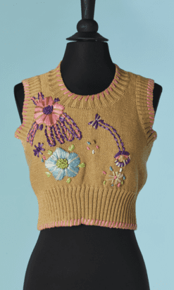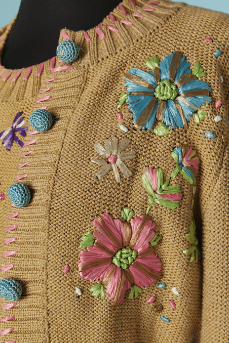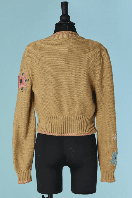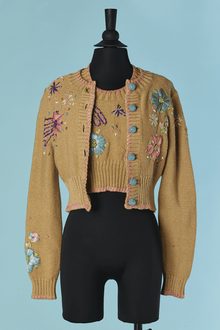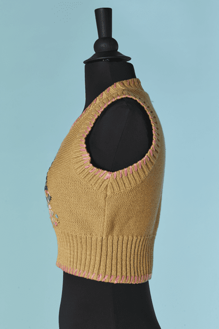 Twin-set Christian Lacroix en coton beige brodé de motifs de fleurs en raphia rose bleu violet, boutons bouton en passementerie bleu ciel, pull sans manches mais le gilet est à manches longues, étiquette orange et noire Taille 34