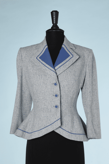 Veste de tailleur 1940 en lainage gris chiné bleu Lilli Annette diminutive, parement en crêpe bleu sur le col, liserés bleus, boutons recouverts, basque