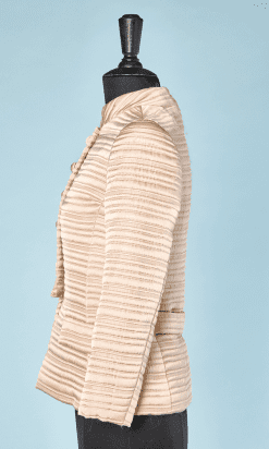 Veste 1960 en satin matelassé écrue, col officier, poches plaquées et boutons recouverts griffée Maggy Rouff.