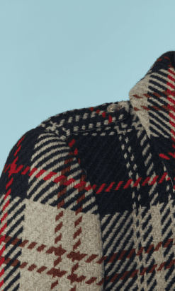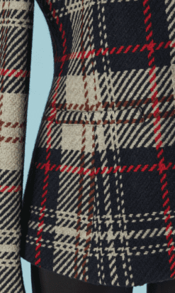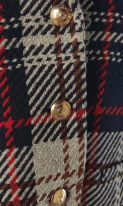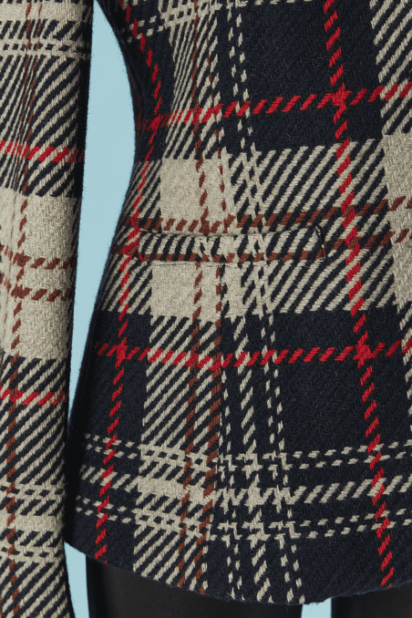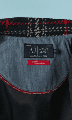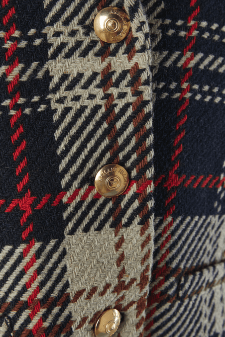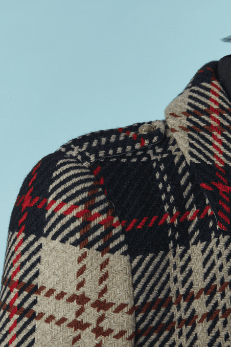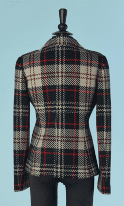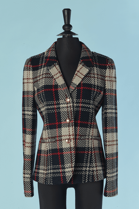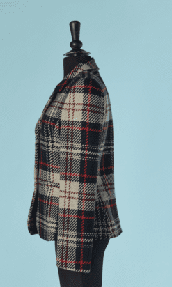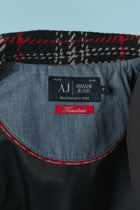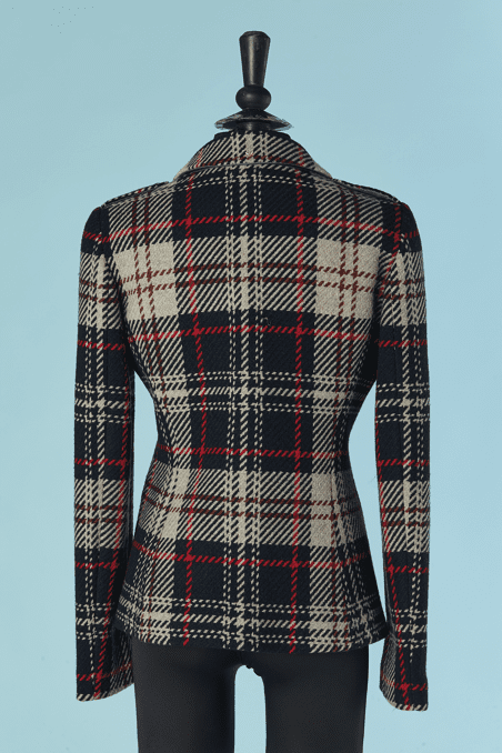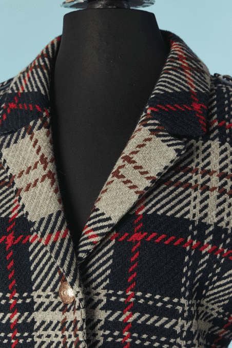 Veste Armani en laine tissé écossais.Fine épaulettes. Boutons en métal doré de la marque et boutonnière sur le milieu du devant. Poche sur les deux côtés.