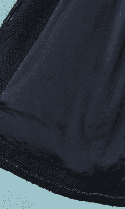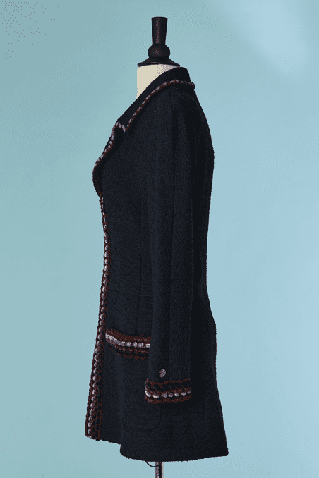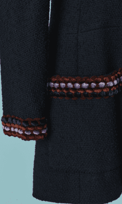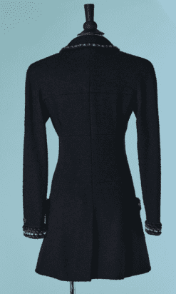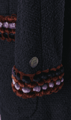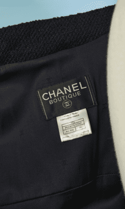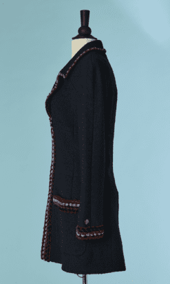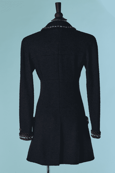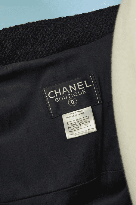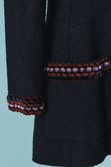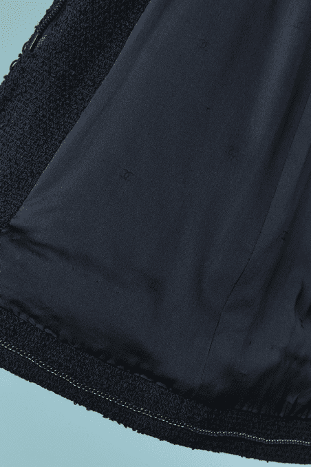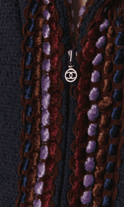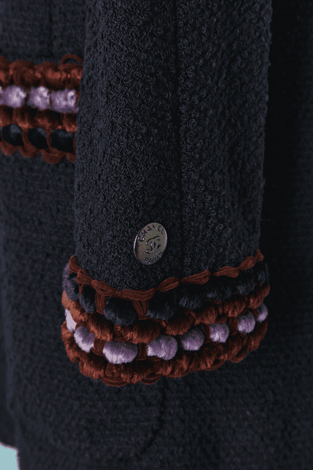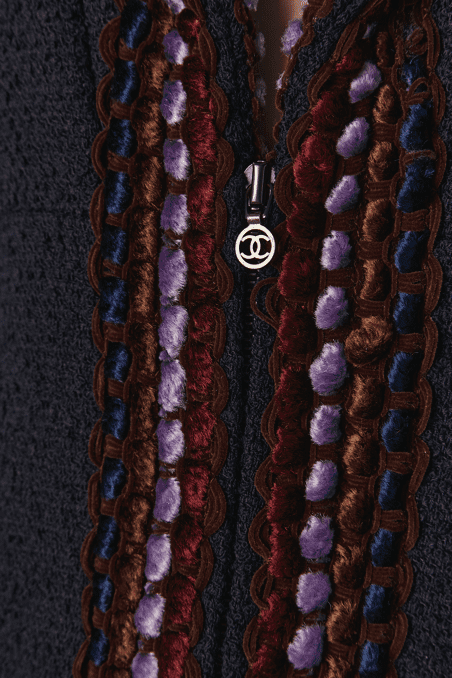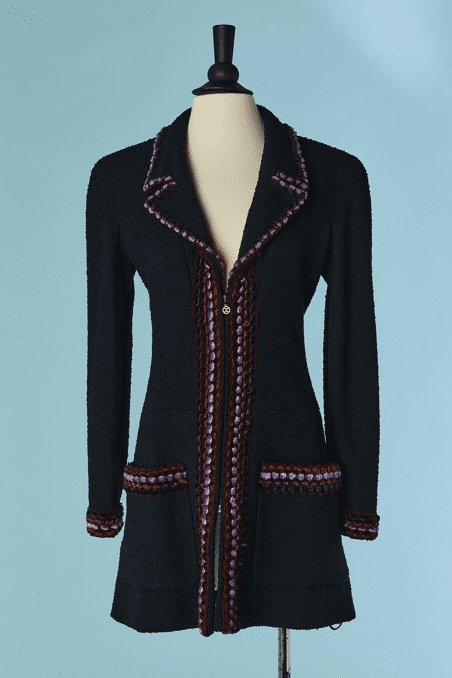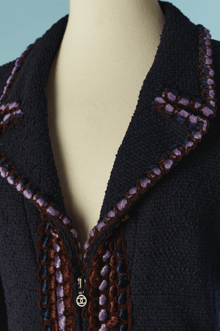 Veste Chanel 1997 en tweed marine et passementeries en velours chenillé, fermeture éclair avec logo Chanel, manches longues épaulées avec boutons, fente dos, doublure en soie marine et chainette, étiquette noire et blanche taille 38