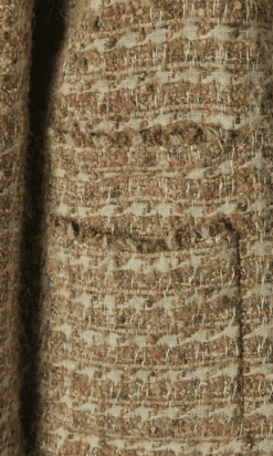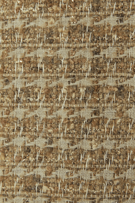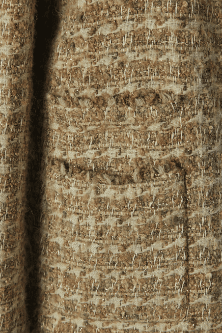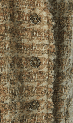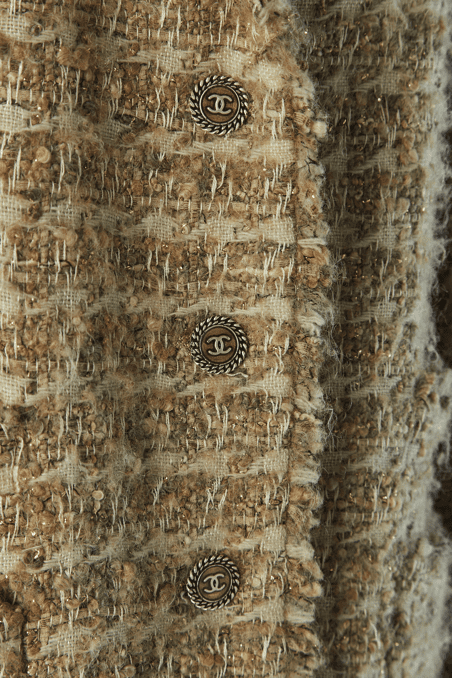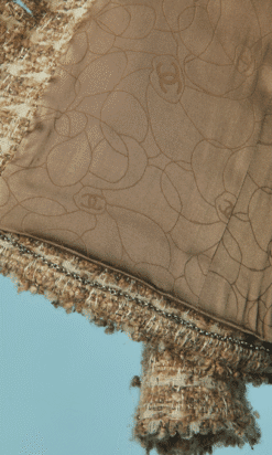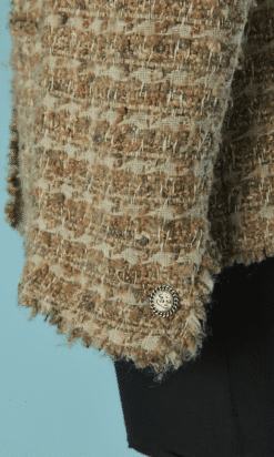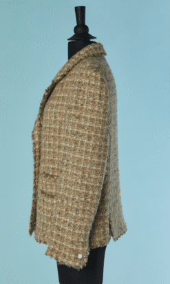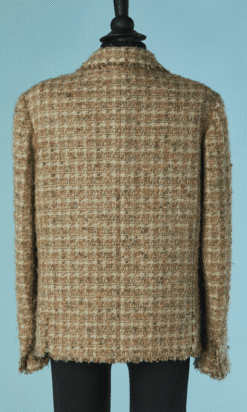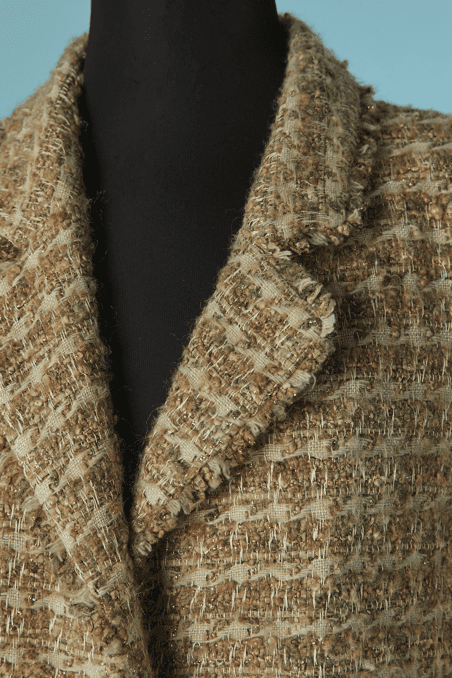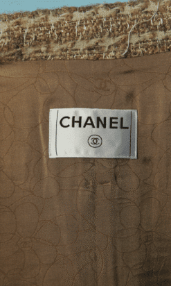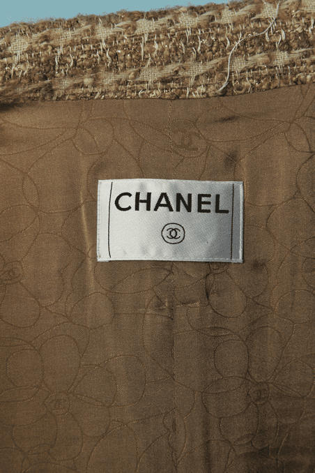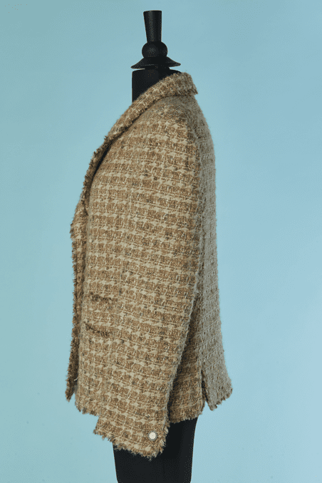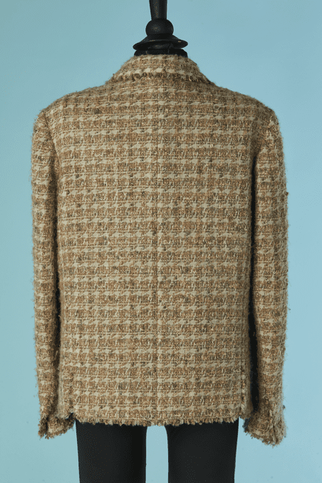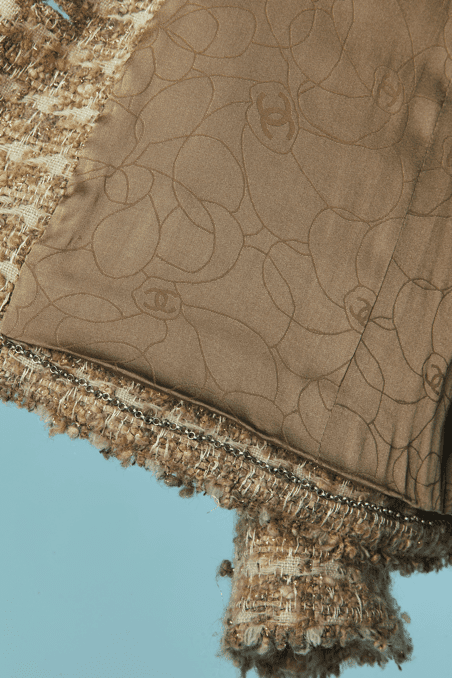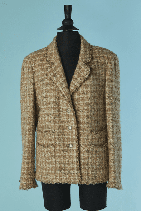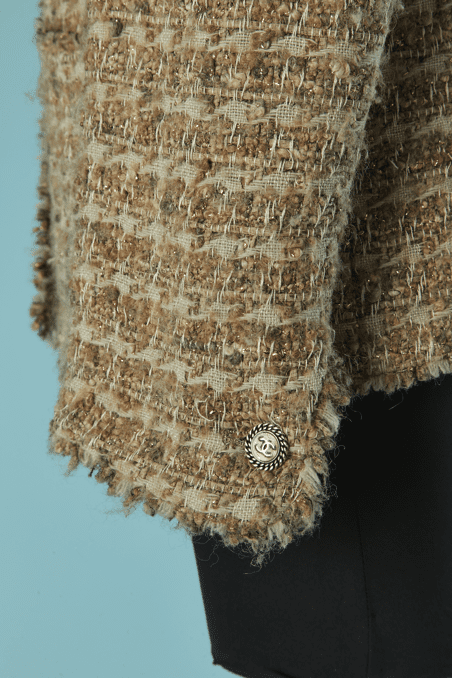 Veste Chanel en tweed beige écru et fils d’or, col châle cranté, manches longues effrangées, boutons Chanel en métal émaillé avec double C au milieu, double poches superposées, doublure en soie taupe avec camélias, chaine argentée, étiquette blanche et noire