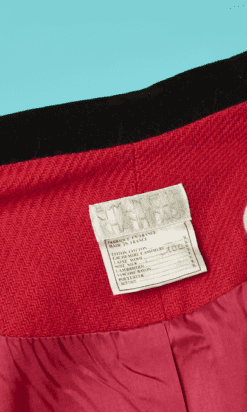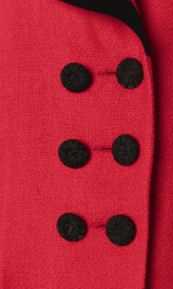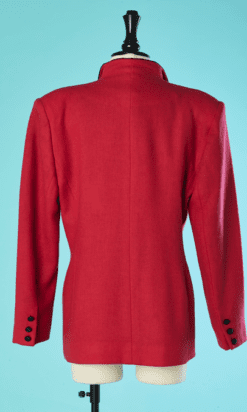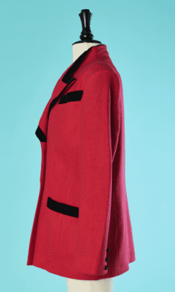 Veste Emmanuelle Khanh circa 1980 en lainage tissé rouge rosé et parements en velours noir velours, boutons en passementerie noirs, manches longues très épaulées avec boutons aux poignets
