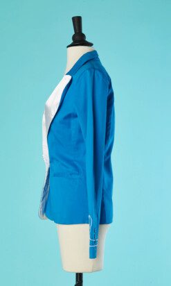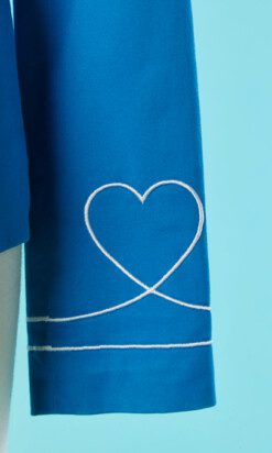 Veste Jean Charles de Castelbajac en coton turquoise et satin gris argent, col châle en forme de cœur, manches longues boutonnées avec cordelettes argentées brodées en forme de cœur, taille cintrée, doublure argentée