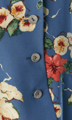 Veste kenzo jungle sans manches en viscose bleue à motifs de fleurs tropicales, col châle cranté, boutons gris