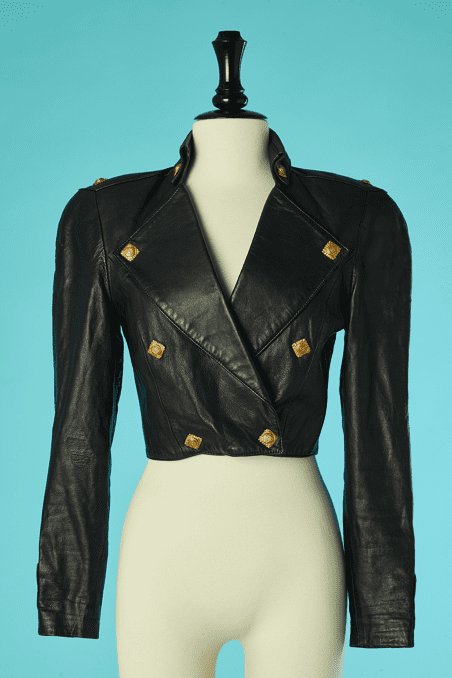 Étiquettes : Veste courte 1980 Michael Hoban, Veste courte 1980 Michael Hoban en cuir, Veste courte 1980 Michael Hoban en cuir noir, Veste courte 1980 Michael Hoban en cuir noir et boutons dorés, Veste en cuir 1980