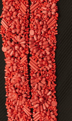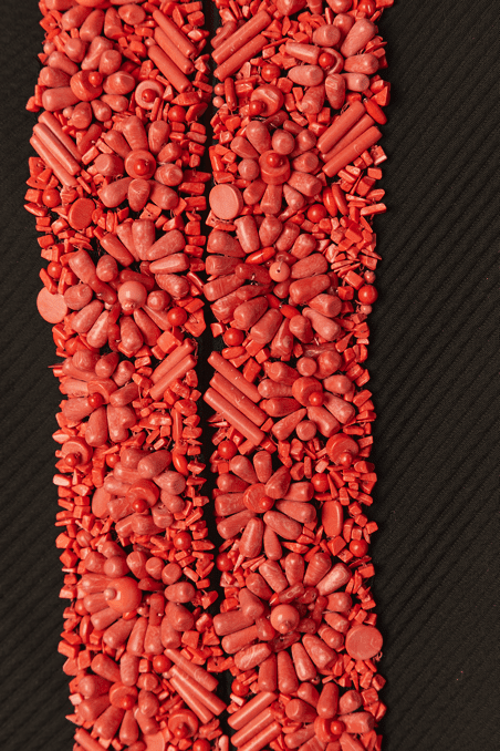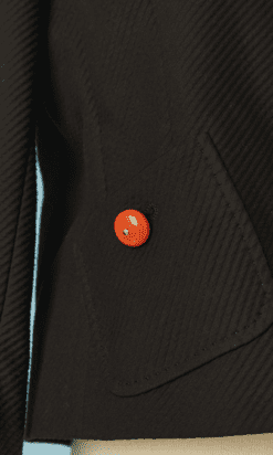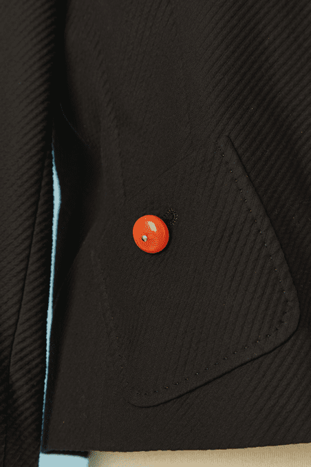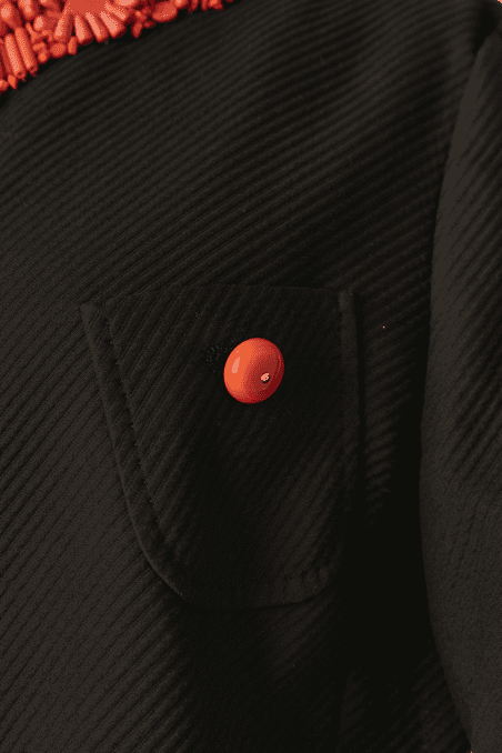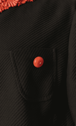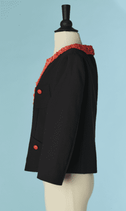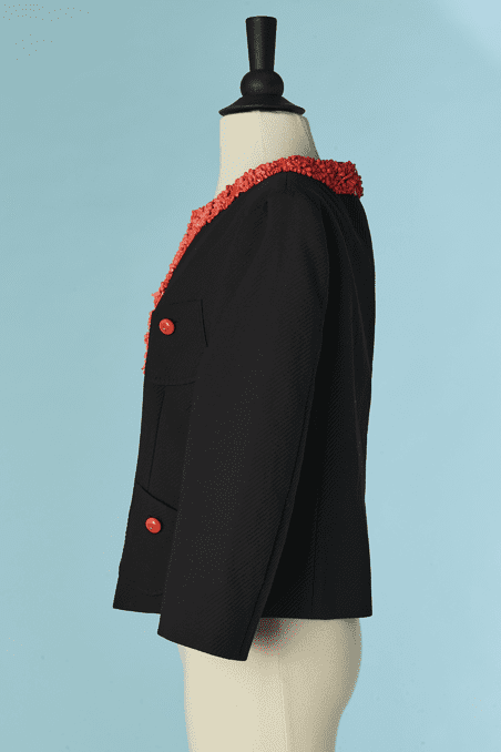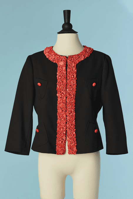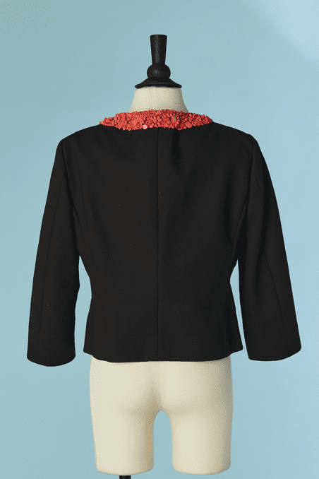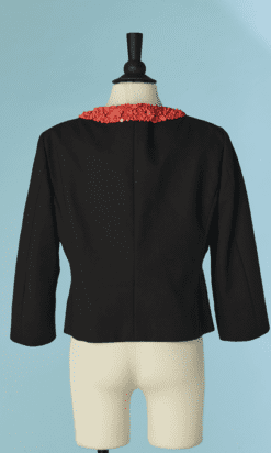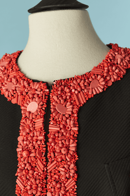 Veste Moschino en piqué de coton noir brodée de perles de couleurs corail sur l’encolure et le devant, fermé par crochets, poches poitrine et taille avec boutons ambrés, taille cintrée, manches longues, étiquette blanche et noir cheap & chic t42