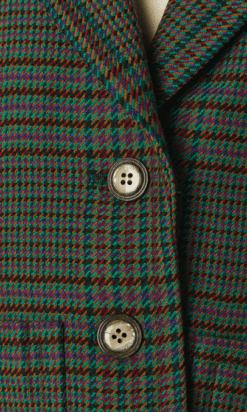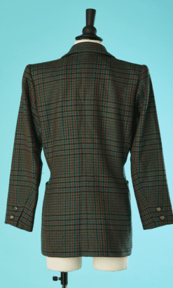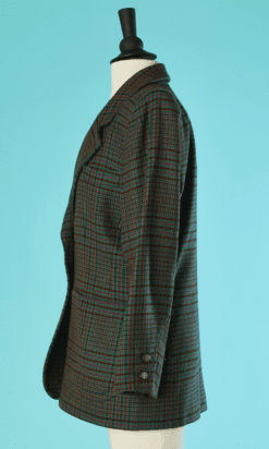 Veste Saint Laurent 1980-1990 en lainage tissé vert, rose, bleu, marron, manches longues épaulées, col châle cranté, poches plaquées et une poche poitrine, taille légèrement cintrée