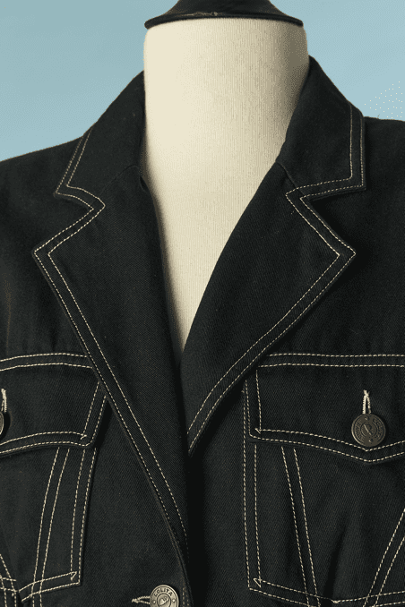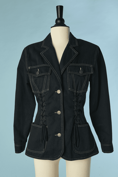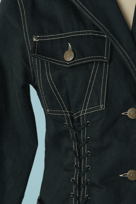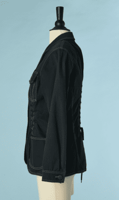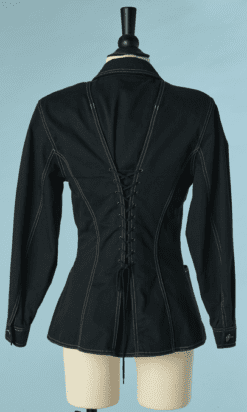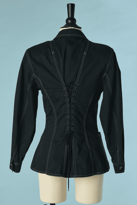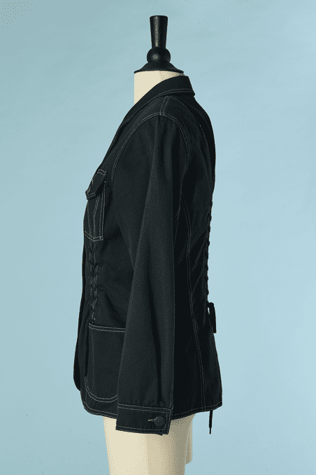 Veste vintage Lolita Lempicka lassée devant sur les côtés et milieu dos, en toile de coton noir, poches poitrine et hanches, surpiqûres écrues, petit col cranté, manches longues, boutons en métal vieil or, étiquette noire blanche et rouge, taille étiquette indiquée 40