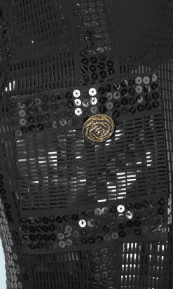 Veste vintage longue pailletée noire, épaulettes, poches poitrine, boutons dorés, paillettes rondes et rectangulaires