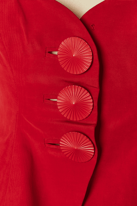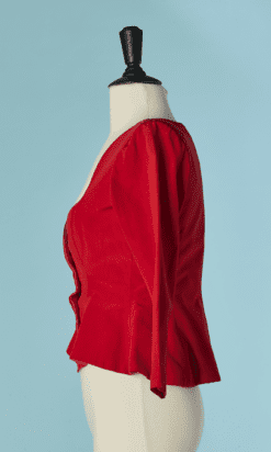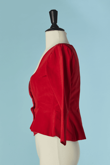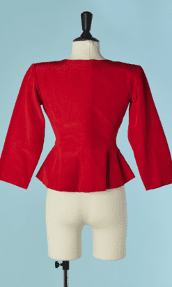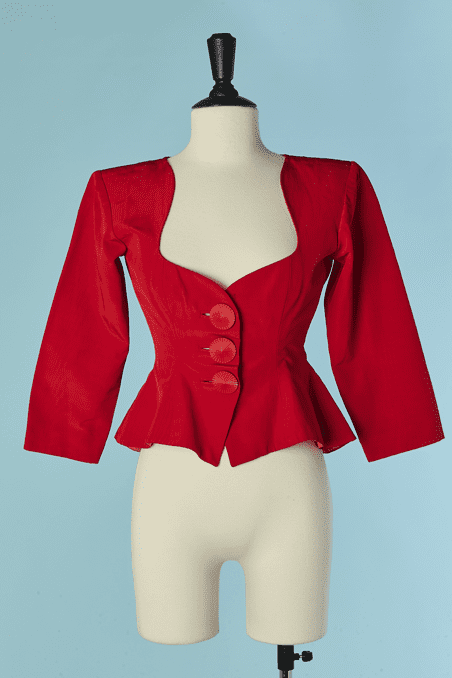 Veste Yves Saint Laurent 1980 en reps moiré rouge, manches longues très épaulées, grand décolleté, taille cintrée, boutons en plastique rouges striés, basque à godets, doublure, étiquette Blanche et noire Taille 34