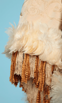 | Agréments | Broderies de fleurs, Franges brodés, Garniture de plumes, Gaufré |