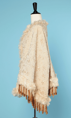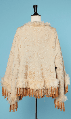 Visite en reps de soie ivoire XIX brodée en relief de motifs de fleurs en soie,bordée de franges en soie blanches et franges gaufrées beige en soie ainsi que de plumes blanches.